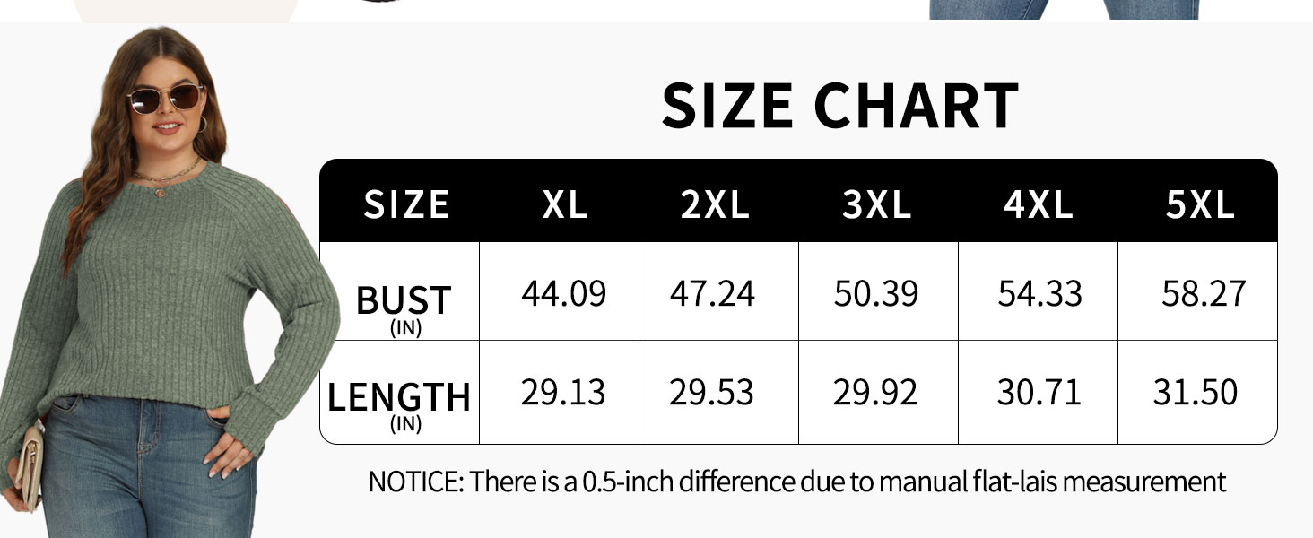 - Plus size long sleeve sweater with standard size chart: XL (14-16W), 2XL (18-20W), 3XL (22-24W), 4XL (26-28W), 5XL (30-32W), fit different body types, please select your usual size